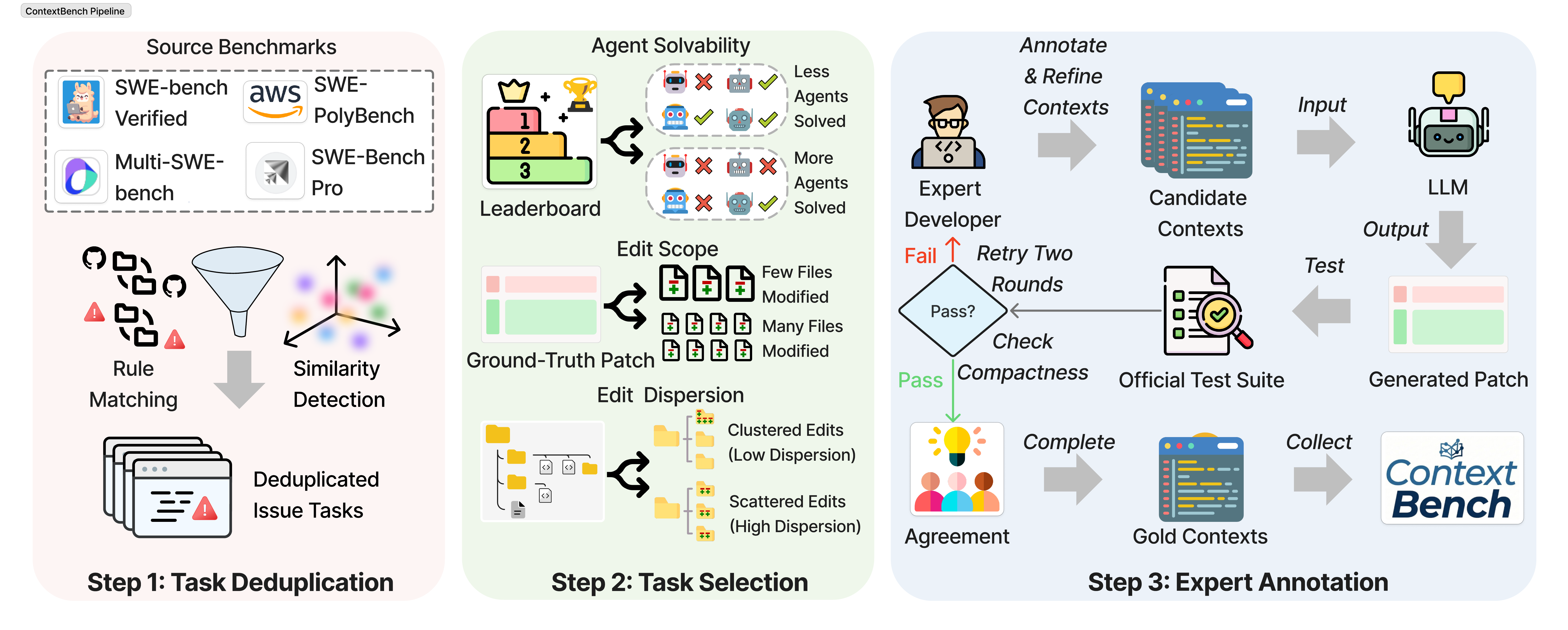 ContextBench evaluates agents through a systematic pipeline that compares predicted context (from agent trajectories) against gold annotations (human-verified context) at multiple granularities.